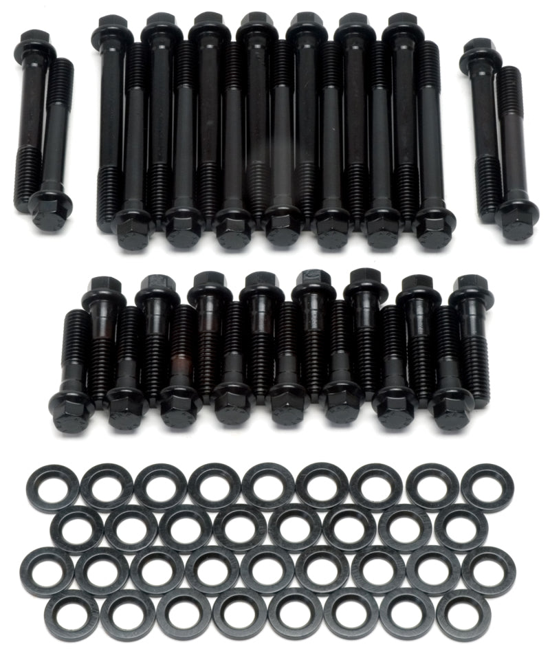 The Edelbrock #8550 bolt kit contain a complete set of the highest quality head bolts and hardened washers available. Cold-formed to ensure molecular integrity and heat treated prior to thread rolling and machining. Reduced diameter bolt heads eliminate the need for valve train removal to facilitate cylinder head re-torqueing. Hardened and parallel-ground washers are included. Rated at 170,000 p.s.i.