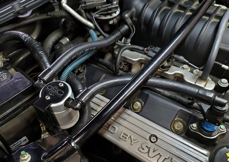 During the process of venting crankcase pressure back through your intake track, large amounts of oil, in the form of vapors can gather/accumulate in your intake tube, intake manifold runners and even dilute your gas, lowering its octane level. This happens on all engines and is even worse with forced inducted vehicles (supercharged and turbocharged) as crankcase pressures are increased. To combat this, we have developed an oil separator of our own design. Milled from solid billet aluminum this is a rock-solid piece. It has a knurled tank base for easy removal to drain the spent oil and an O-ring seal to prevent any leaks. Filtering consists of a fine mesh stainless steel screen that traps fine oil vapors and releases them once heavy enough to fall. They then pass through a 1/2" thick 1/16th" aluminum honeycomb filter where they grow every larger and then fall into the bottom. By the time the oil gets through the filter it's too heavy to be passed on into the intake. The tank holds 3 oz of fluid, while that may not sound like a lot, you shouldn’t see that much oil in your PCV system. Drain it every 2000-3000 miles and you will never come close to filling it.