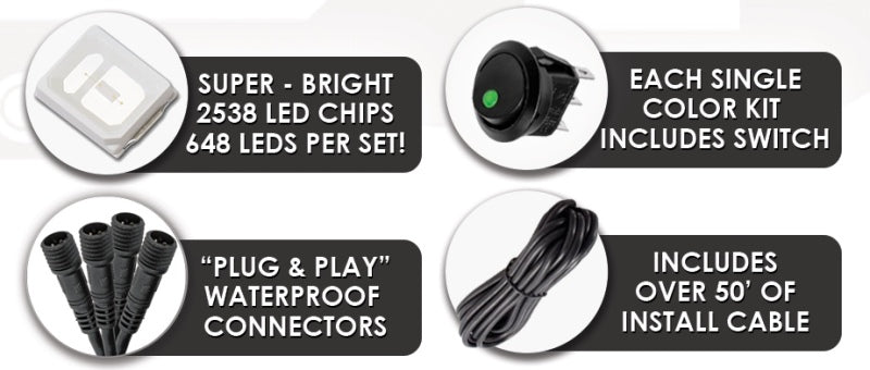 NEW! Double the LEDs. Double the Brightness! Are you looking for the brightest and most attention-grabbing LED wheel ring kit on the market? Look no further than the all-new Double-Wide LED Wheel Ring Kit from ORACLE Lighting! With over 600 LEDs these rings make a powerful impact on any vehicle! The all-new design features Plug and Play waterproof connectors for easy installations. Each ring has over 12" of insulated cable that connects to a wiring hub which makes installation easier than ever. The rings now include (5) mounting brackets per ring and have tapped fittings to easily move and adjust brackets to fit any application. The ring diameter has been increased to 16.5" to fit oversized performance brake systems. ORACLE Lighting illuminated LED wheel rings are an easy and effective way to light up your truck's wheels and suspension! This head-turning lighting product consists of a set of (4) LED illuminated aluminum rings which install around the brake rotor and attaches to the brake dust shield. These can also be mounted to older vehicles with drum brakes. The effect is a large ring of light which accents custom wheels and stands out at events. Oversized 16.5" diameter is the largest on the market and fits oversized brakes. Each ring is equipped with 162 super-bright 2835 LEDs (648 LEDs total) which will outshine any competitors.
